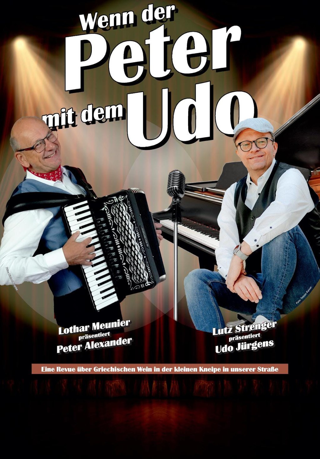Am 11.05.2026 feiern die beiden Musiker Lothar Meunier und Lutz Strenger die Premiere ihres neuen Programms „Wenn der Peter mit dem Udo“ im WIR-Haus Wülfrath. Das Publikum erwartet eine ebenso liebevolle wie unterhaltsame musikalische Hommage an zwei der größten Entertainer des deutschsprachigen Raums: Peter Alexander und Udo Jürgens.